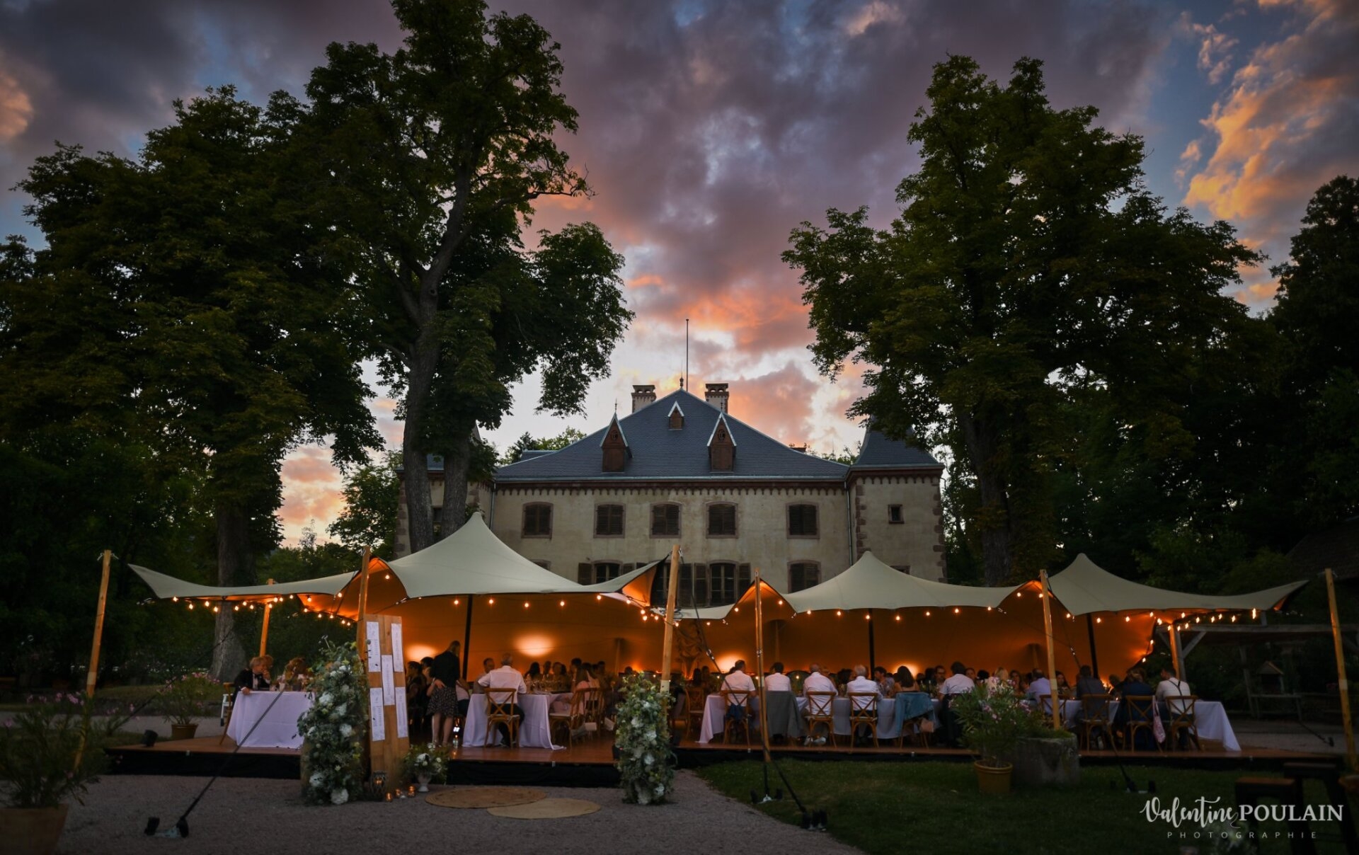 Rien de plus élégant qu'une tente Stretch installée devant un château ! Le montage a été d'autant plus unique que le lieu, car grâce à l'assemblage de deux toiles, nous avons pu former un "L", tant souhaité par les mariés. Pour plus de confort, nous avons installé un plancher.