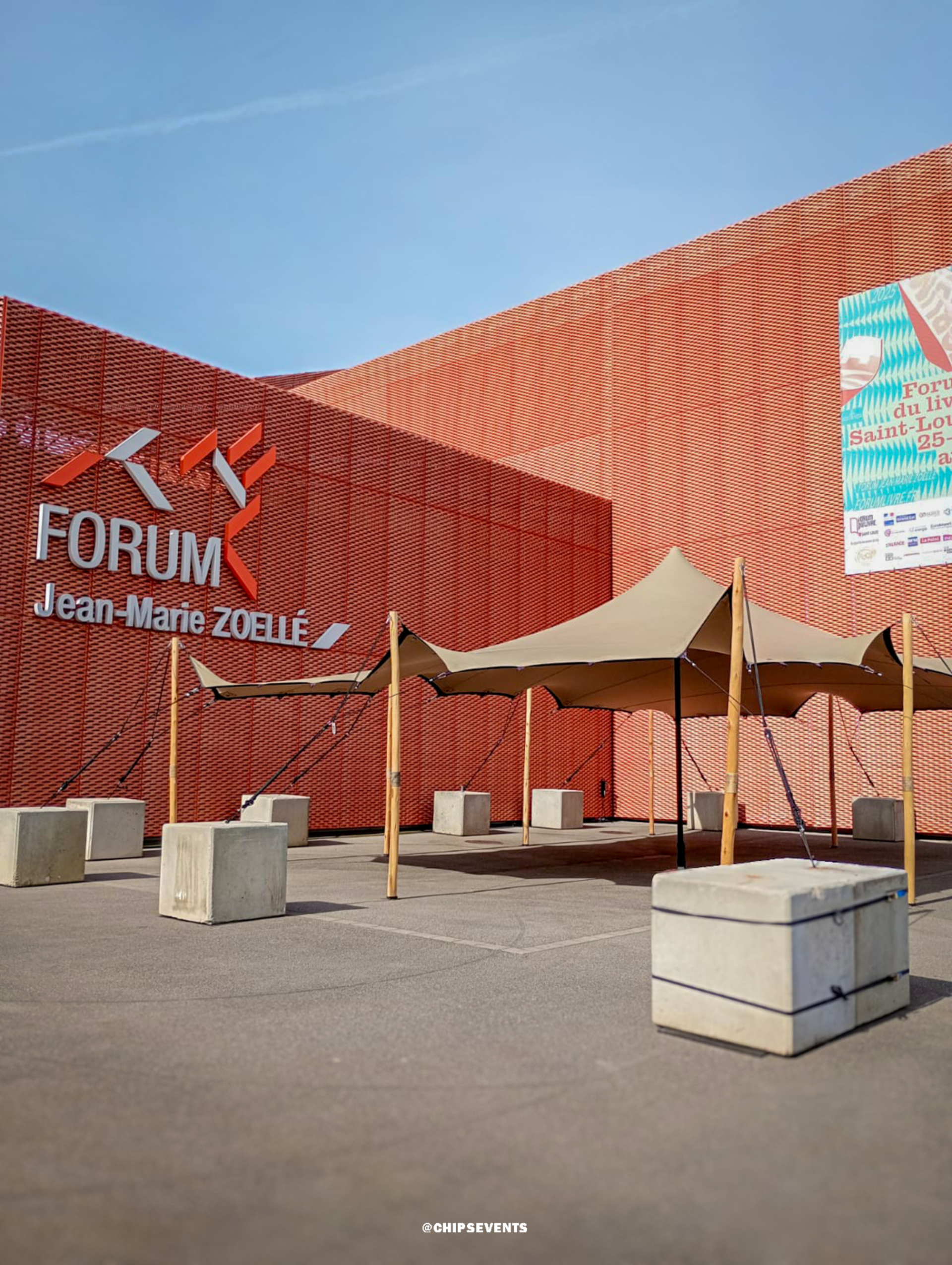 A l'occasion du "Forum du livre", nous avons installé une tente Stretch de 79m², maintenue à l'aide de plots en béton.