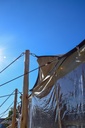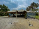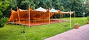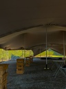 Tente nomade de 157m² Fixée à l'aide de pieux (120 cm) enfoncés dans le sol ou plots béton Tout ouvert : Surface Utile : 157 m² soit 15m x 10,5m Hauteur nécessaire : 4.5m Réponds aux normes CTS, NF...